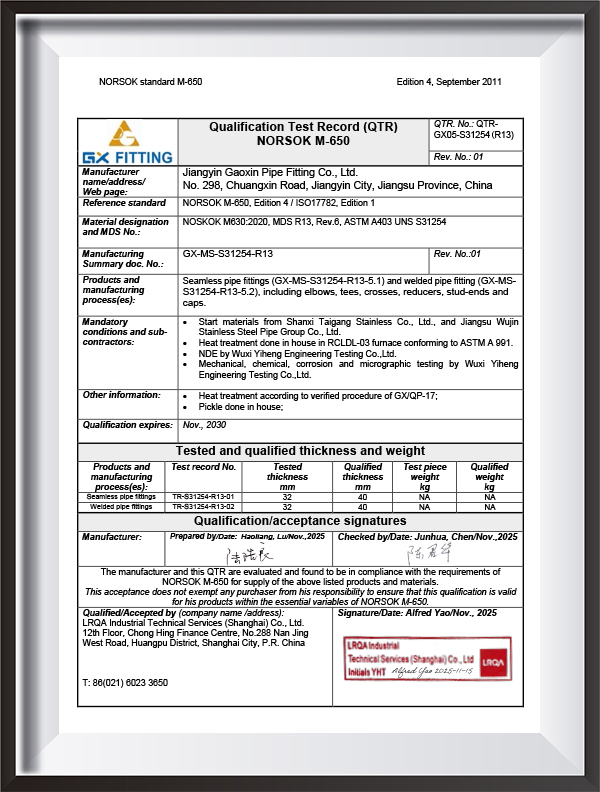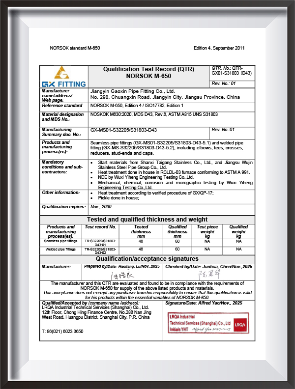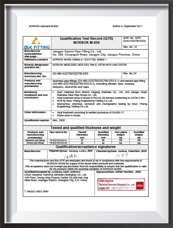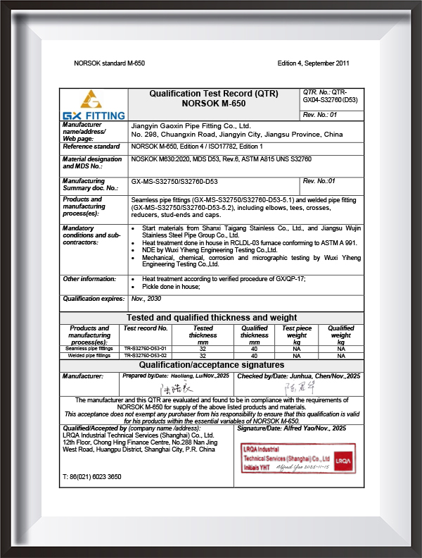 | Testimonium | PED, AD2000, EAC, ABS, BV, DNV, NORSOK M650, ISO9001, ISO14001, ISO45001, etc. |